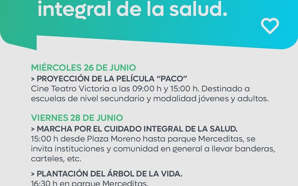 Viernes 28 de junio Marcha por el Cuidado Integral de la Salud: 15:00 h desde Plaza Moreno hasta parque Merceditas, se invita instituciones y comunidad en general a llevar banderas, carteles, etc.