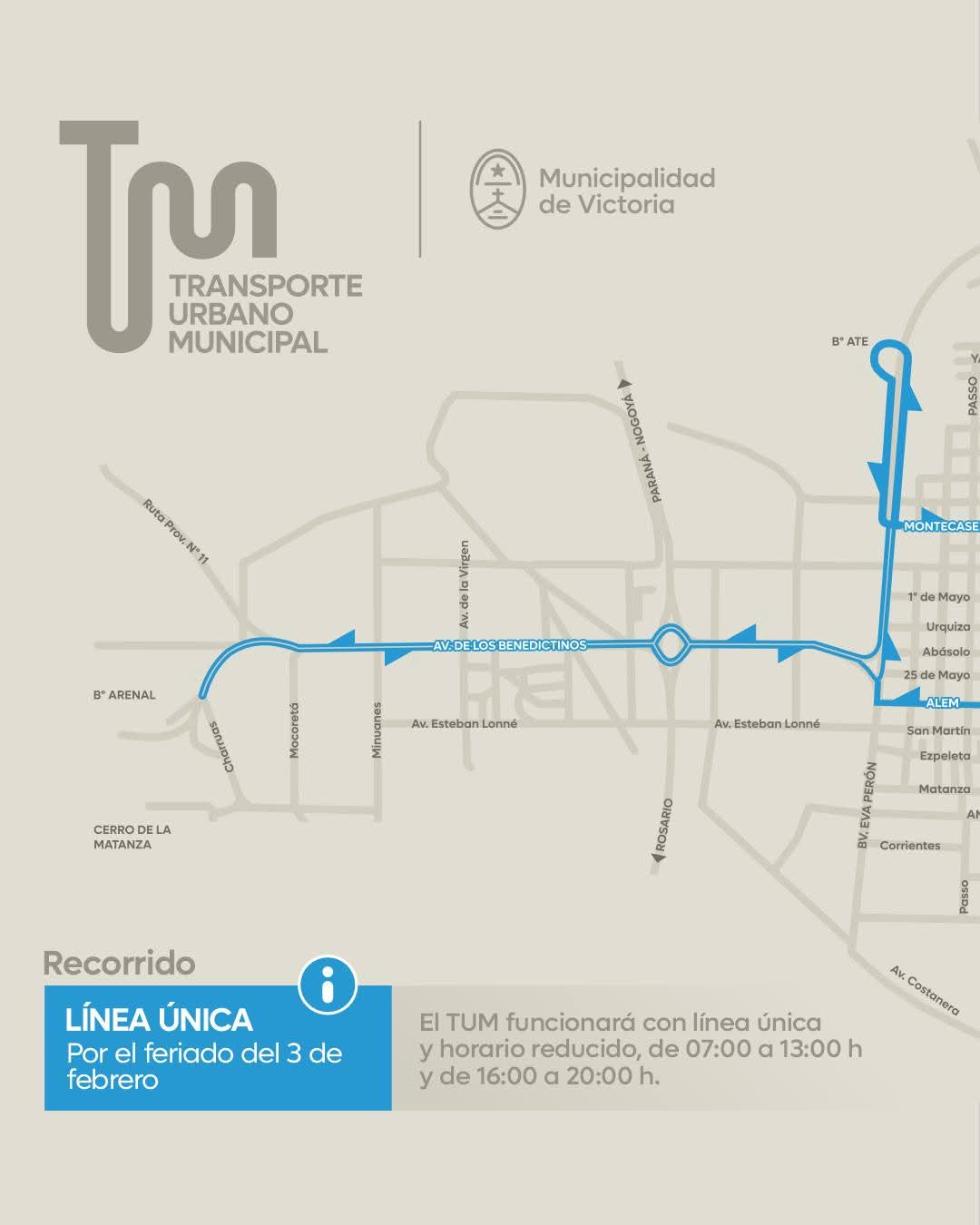 🟡 El TUM funcionará con línea única y horario reducido, de 07:00 a 13:00 h y de 16:00 a 20:00 h.