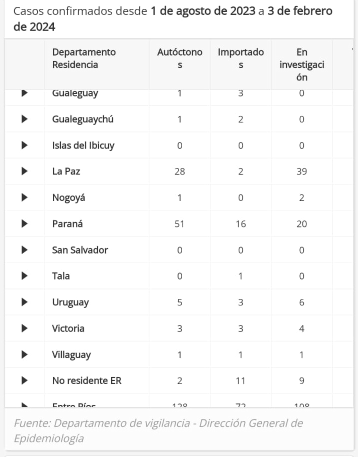 Los departamentos que más casos registran son: Paraná (87), La Paz (69), Federación (51) y Concordia (31).