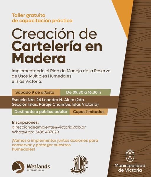 Sumate a este taller de capacitación práctico y gratuito donde aprenderemos a crear cartelería en madera, implementando juntos el Plan de Manejo de la Reserva de Usos Múltiples Humedales e Islas Victoria.