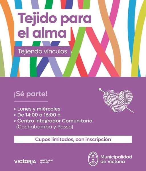 HomepageLocalesTaller de Tejido Locales Sociedad Taller de Tejido Victoria Al Día Posted on 23/04/2026 Victoria Lunes y miércoles De 14:00 a 16:09 h CIC (Cochabamba y Passo) Taller sin arancel. Cupos limitados. Inscripciones por Mesa de Entrada del CIC (Cochabamba y Passo), de lunes a viernes, de 07:00 a 19:00 h. Navegación de entradas Previous PostDebe más de 7 millones de pesos de cuota alimentaria y le impusieron severas sanciones Next PostGoogle Maps habilitó aviso de radares en Argentina en tiempo real: cómo activarlo paso a paso You Might Also Like Noticias Recomendaciones para viajar seguro en Semana Santa Victoria Al Día 17/04/2025 Noticias Frigerio y Aluani recorrieron la Expo Provincial de la Leche en Nogoyá Victoria Al Día 17/04/2026 Noticias Convocan a educadores para una capacitación virtual sobre Becas Progresar Victoria Al Día 30/11/2024 Noticias Visualizaron a un yacaré de dos metros en el puerto de Victoria Nogoyá Times 18/06/2023